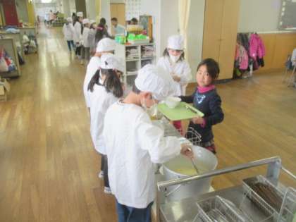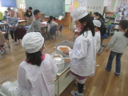 給食の時間、1年生も自分たちでどんどん準備ができるようになりました。机をそろえて、手を洗って配膳を待ちます。当番の子どもたちも素早く盛りつけ、いただきますも早くできるようになりました。さらに、モリモリよく食べおかわりもしっかりしています。心も体もすくすく成長している1年生です。