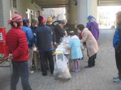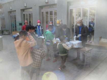 1時間ちょっとで大きな防災鍋で作ったカレーは売り切れてしまい、今回初めての企画として行われたイベントは大好評で終了しました。おばあちゃんと来た子や、小さいお子さんを連れて食べに来た親子など、いろいろな方々に味わっていただきました。「3.11」の日に、忘れかけていた防災意識を確認していこうと計画された炊き出し訓練としての取組でしたが、地域や家族の絆も確認でき、素敵なイベントになりました。おやじの会のお父さん方、早朝から準備と片付け、本当にありがとうございました。来年度もよろしくお願いします。