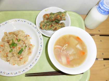「鶏めし、竹輪の磯辺揚げ、呉汁、牛乳」です。