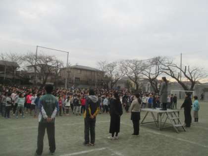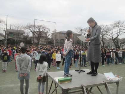 今朝はちょっと肌寒い中での全校朝会となりました。校長先生からは、いつも時間前に整列して朝会や集会が始められる八幡山小の伝統を大切にしながら、校内の施設やみんなが使う道具なども大事にしていこうというお話がありました。また、先週に続き今朝も、都の書写展に出品された児童や、スポーツで頑張っている選手たちの表彰がありました。3学期も残り10日を切りました。体調管理に気をつけながら、今週も元気に過ごしていきましょう。