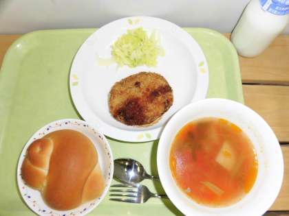 「ミルクパン、コロッケ、ゆでキャベツ、ミネストローネ、牛乳」です。