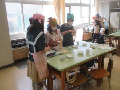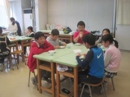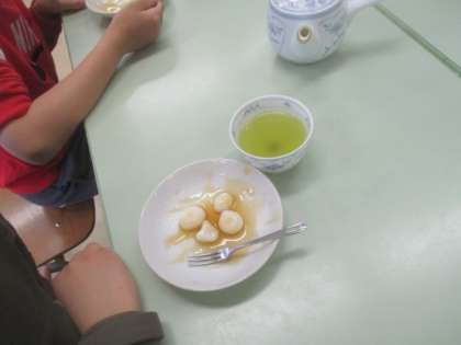 5年生は、今日が最後の家庭科の授業。両クラスとも調理実習で白玉団子を作りました。班で話し合って役割分担をし、みんなで協力して作業を行います。試食会には担任の先生も招待して、いっしょに自作の白玉の味を堪能していました。