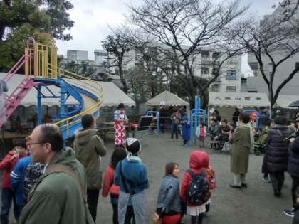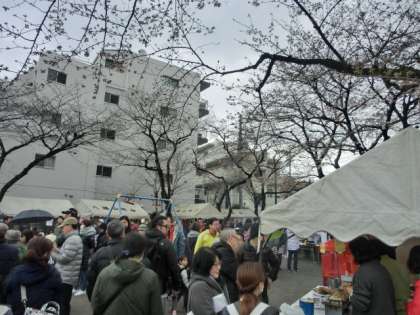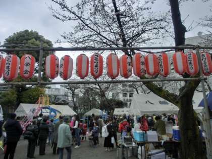 今日は各地で桜まつりが開催されていますが、八幡山地域桜まつり実行委員会並びに、八幡山八栄会主催の「桜まつり」は、今回で22回目を迎えました。こちらでも、多数の模擬店や、大道芸人のアトラクション、ビンゴゲームも行われ、小雨がちらつくあいにくの天気でしたが、大勢の人たちでにぎわっていました。桜はまだ三分咲き程度でしたが、楽しい春のひとときになりました。