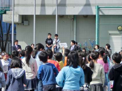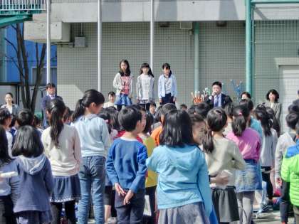 始業式の最後は、全校での校歌斉唱です。春晴れの青空に元気な歌声が響き渡りました。次に新学期から八幡山小学校の転入する友だちの紹介がありました。新1年生をあわせて447名で、八幡山小学校の平成29年度は無事スタートしました。