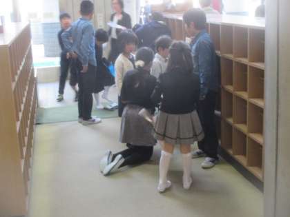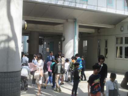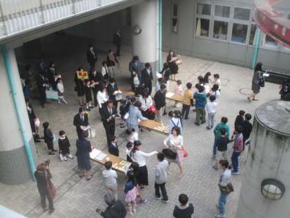 始業式の後は、新1年生の入学式です。家族といっしょに、かわいらしい1年生がぞくぞくとやってきました。受付を済ませ緊張する1年生を、6年生のお兄さんやお姉さんたちがやさしくお世話をしました。10時30分、いよいよ式が始まります。