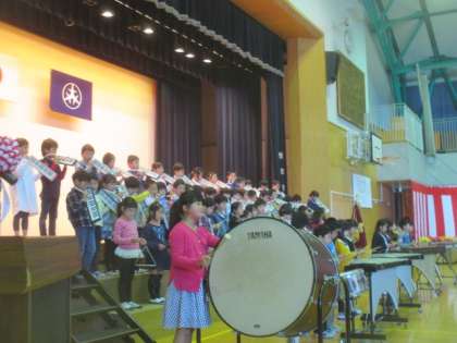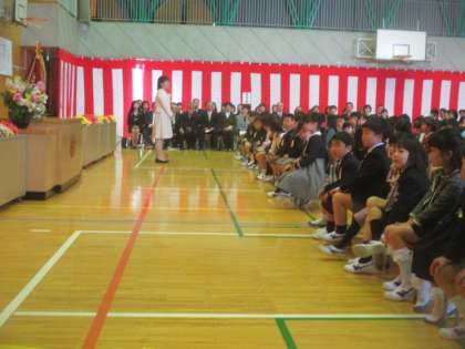 たくさんの来賓の方々にも参列していただき、お祝いの言葉をいただきました。そして、担任の先生の発表。1年生は、ドキドキしながら先生の顔をしっかり見ていました。その後、お世話になるいろいろな教職員の紹介もありました。1年生は、最後までしっかり話を聞くことができていました。 2年生のお兄さんやお姉さんからは、歓迎の出し物がありました。昨年は迎えられる側だった2年生も、1年で立派に成長した姿を披露することができました。