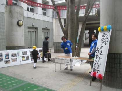 八幡山小学校で活躍していただいている「おやじの会」のお父さんたちが、入学式に広報活動をしました。新1年生の保護者の方々にも関心をもっていただき、ぜひ入会していただきたいと思います。よろしくお願いいたします。