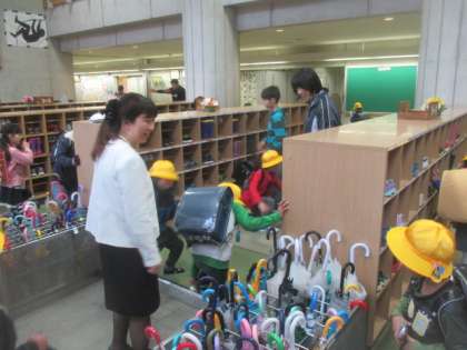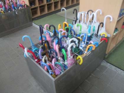 雨降りの登校になり、下駄箱では傘を片付けて教室に上がります。慣れない1年生は、傘立てに傘を入れるまでが一苦労で、先生がお手伝いすることも多いのですが、みんな自分でしっかりと片付けができていました。大変立派で感心しました。傘立てもすっきりと整理され、ここまできると帰る際にも混乱はありません。全員、「よくできました!」