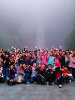 薄日がさしてきました。霧に煙る華厳滝。水量は多いそうですが、ちょっと体感できず・・・。それでも、こどもたちは歓声をあげていました。写真は華厳滝の前ですが、見えますか?
