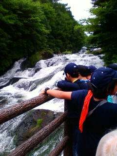 赤沼からバスに乗り、竜頭の滝上から歩いて滝を見ました。オリエンテーリングの途中で降ったどしゃ降りの雨もすっかりあがりました。