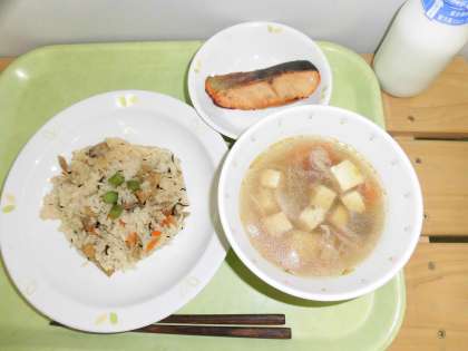 献立は「ひじきごはん、鮭の照り焼き、けんちん汁、牛乳」でした。