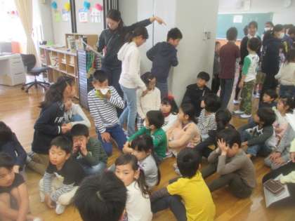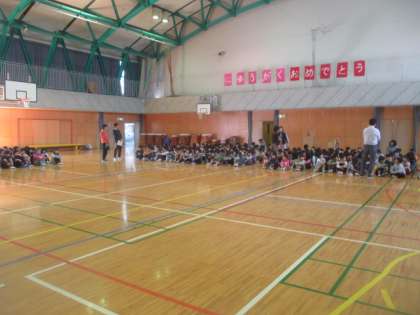今年最初の集会は、新1年生を迎えて、全校児童がそろう初めての集まりになります。朝から6年生は1年生の教室に行ってお世話をし、1年生の手を引いてみんなが待つ体育館に入場します。