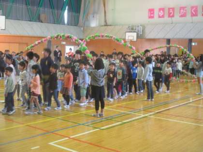 大きな拍手に迎えられ1年生が入場します。優しい6年生のお兄さん、お姉さんに導かれ、1年生はみんな笑顔いっぱいです。