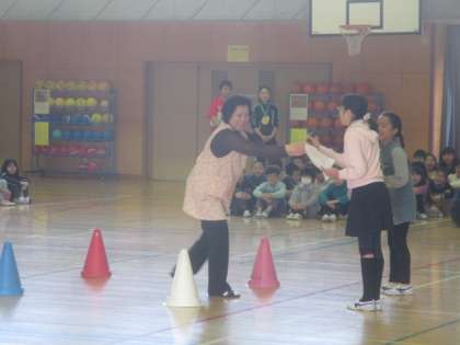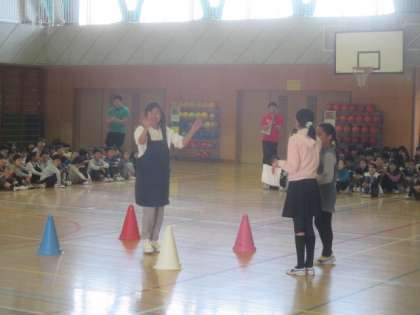 先生紹介は、1年生に関係する先生たちが登場して、一問一答で1年生にアピールしました。全校ゲームは学校に関係するクイズです。今年の全校児童の数や学級の数などの数字にまつわるものや、人気の給食メニューなどがクイズとして紹介されました。