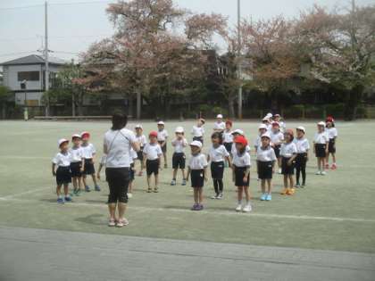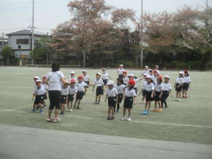1年生は、今日はクラス単位で体育の授業を行いました。1組は校庭で、身体ほぐしの運動です。先生の号令に従って、元気に課題に取り組み、笑顔でいっぱいの楽しい授業になっていました。