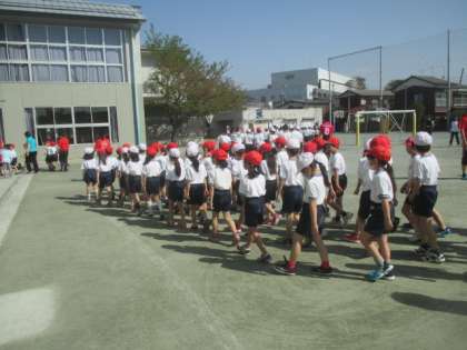 今日の体育朝会では、終了後の昇降口に戻るまでの行進練習も徹底して行いました。1年生も大きく手を振って歩くことができていました。3年生は真っ直ぐ縦横の列が揃うまで、繰り返し練習していました。