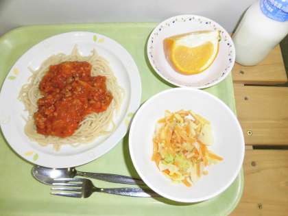 「スパゲティミートソース、じゃが芋のハニーサラダ、甘夏みかん、牛乳」です。