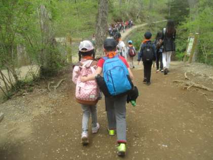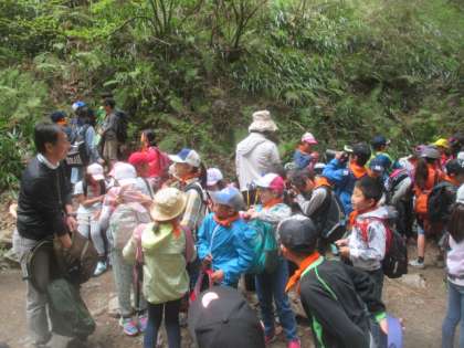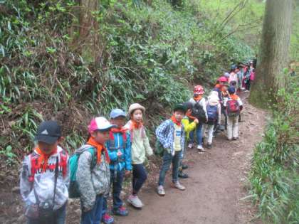 途中休憩を何回かはさみながら、およそ3.5キロの山道を歩きます。子どもたちはお互いに助け合い、励まし合いながら、山頂目指してがんばりました。