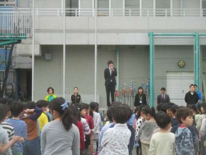 今朝の全校朝会では、未定だった算数少人数指導に当たる新規採用の先生と、英語活動の外国人講師の先生の紹介がありました。若い元気な先生と、とても明るいALTが加わり、さらに八幡山小学校は活気づいてきました。