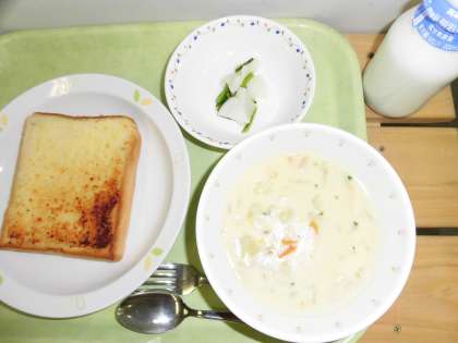 「ガーリックトースト、チャウダー、蕪のレモンかけ、牛乳」です。