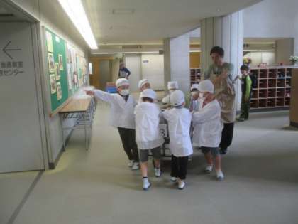 1年生の給食当番が、担任の先生とワゴンを運んでいます。楽しみにしている給食の時間です。お手伝いもしっかりできる1年生。今日も残さず、もりもり食べてくださいね。