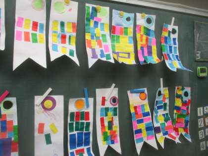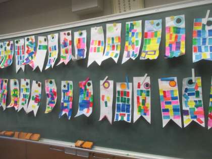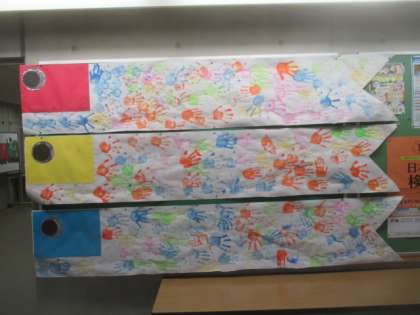 1年生が作った鯉のぼりの作品が掲示されました。個々の色鮮やか作品と、みんなの手型でうろこを表現した大きな3匹の鯉のぼりです。「こどもの日」を1週間後にひかえて、大小たくさんの鯉が校内を泳いでいます。