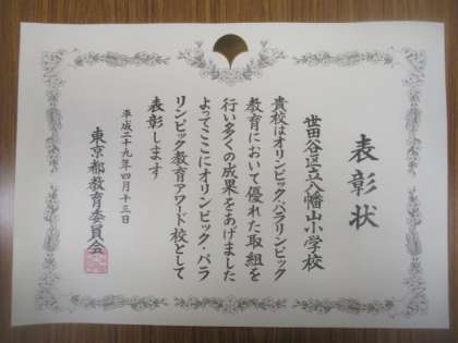 本校の昨年度のさまざまなオリ・パラ教育の活動や取組が評価され、東京都教育委員会より表彰されました。今年度もアワード校として、子どもたちの体力向上やオリンピック・パラリンピック教育の推進を進めて参ります。
