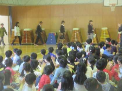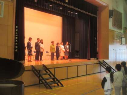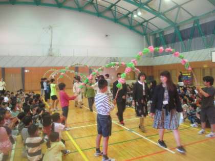 その後、いよいよ子どもたちとの対面です。花のアーチを通って先生方が入場します。懐かしい先生方との再開を楽しみにしていた子どもたちが体育館に集合し、盛大な拍手でお迎えしました。
