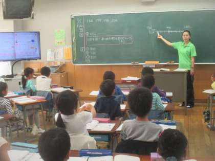 2年1組では、算数の授業で、「1000までの数」について勉強しました。まずは、100までの数について、10のかたまりをもとにして考えます。1年生で学んだことを生かしながら、先生の質問に積極的に手を挙げて発言していました。数直線を使って考えると分かりやすいことを知って、さらに学習の理解を深めることができました。