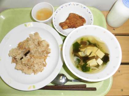 「中華おこわ、鰹の竜田揚げ、すまし汁、フルーツゼリー、牛乳」でした。