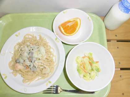 「スパゲティクリームソース、キャベツサラダ、清見タンゴール、牛乳」です。