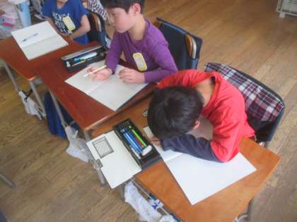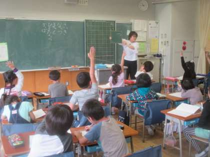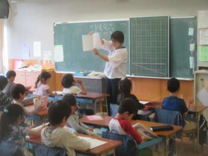 1年1組では、国語のひらがなの学習で、初めてノートを使って勉強しました。新しい真っ白のノートに、先生の指示に従って習いたてひらがなで文章を書きます。たくさん書きたい気持ちは分かりますが、まずはじっくりていねいに練習していきましょうね。