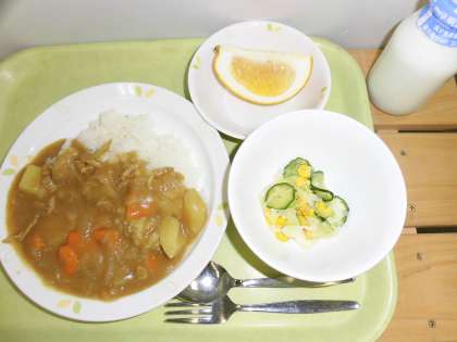 子どもたちの大好きなカレーです。今日はこま切りの豚肉で作りました。簡単に大量に作ることができて、元気のでるメニューです。あちらこちらからのお変わりのリクエストに全部応えることができなくて、心苦しい思いです。