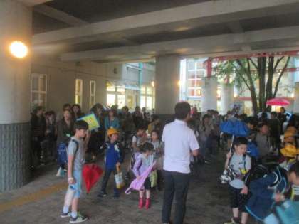 各教室での活動が終わり、いよいよ下校開始です。最初に、学童クラブに行く児童が6年生に連れられて移動しました。その後、放送に従って、3階の教室の班から順番に下校します。今日は雨なので、ピロティに集合しました。そこでも再度人数の点呼を行い、全員そろった班から下校します。雨が降る中ですが、しっかり通学路や危険箇所を確認をしながら帰ります。放送からおよそ30分後、何とか全ての班が報告を終えて下校することができました。PTA校外委員の皆さん、そして、班長・副班長・書記などで活躍した6年生の皆さん、今日は雨の中、本当にお疲れ様でした。ありがとうございました。