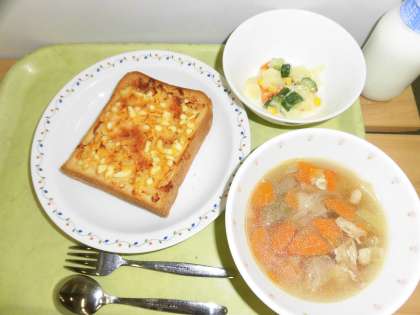 「卵トースト、白いんげん豆の田舎風スープ、マセドアンサラダ、牛乳」です。