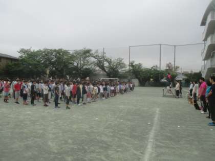 どんより曇り空の朝でしたが、今朝も子どもたちは元気に登校してきました。全校朝会も8時30分には全員集合して、いつものように時間通りに始められました。