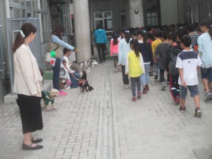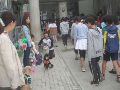 全校朝会が終わり、子どもたちが教室に戻るのを、ワンちゃんたちが見送ってくれました。吠えたりせず、とてもやさしいワンちゃんたちです。見送られる子どもたちの行進も、いつになくしっかりできていました。
