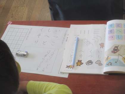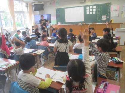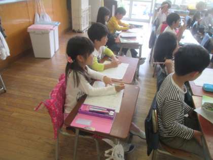 1年2組の4時間目は、国語の授業。習った九文字のひらがなを並べて、いろいろな言葉を見つける活動です。友だちの名前を作ったり、同じ字を2回使って言葉を作ったりして、20個以上の言葉を見つけ、発表していました。最後にワークシートに見つけた言葉をていねいに書き、今日の勉強は終わりました。今日も4時間がんばりましたね。