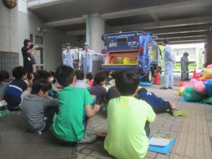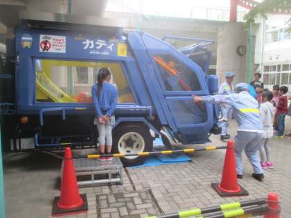 4年生は、砧清掃事務所の方々にご来校いただき、清掃車の見学と体験、ゴミの行方についての授業を受けました。ピロティに登場した清掃車を目の前にして、子どもたちは大興奮。清掃車の機能や仕組みの説明を受け、ゴミ回収の体験もさせていただきました。