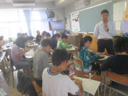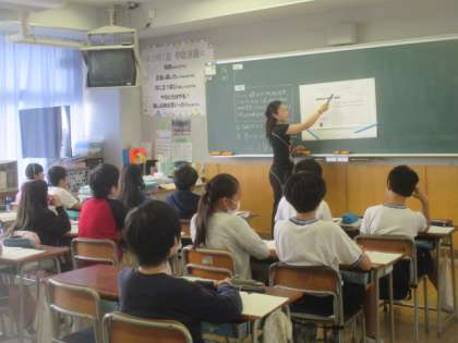 6年生の算数の授業も習熟度別の指導が始まりました。今日は「分数のかけ算」の導入です。算数少人数担当の新採の小林先生は、一番人数の多いステップのクラスを担当。学習の約束を確認しながら、準備した教材を使って必死に1時間の授業を展開していました。それぞれの教室で使う教材は同じでも、アプローチの仕方が違います。1組のホップのクラスは、既習内容の復習もしながら、子どもたちの反応をていねいに取り上げて進めていました。どのクラスの子どもたちも、一生懸命に課題に取り組んでいました。