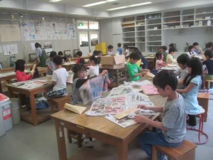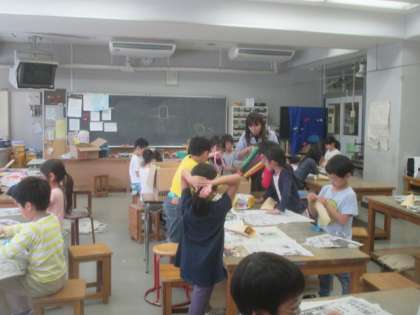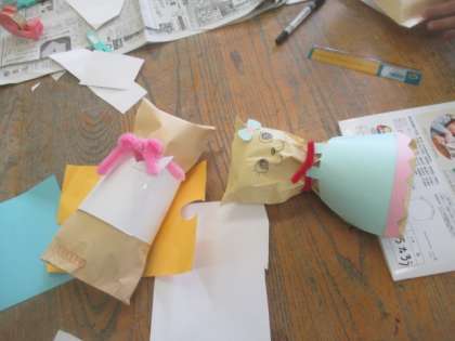 3・4時間目の2年2組の図工の授業は、封筒を使った造形活動です。封筒に新聞紙を詰めて整形し、色画用紙やモールなどで飾り付けをして、自分が飼いたい猫を作ります。制作途中で友だちの作品を鑑賞し合うなど、自分の作品作りの参考になるような働きかけもあり、子どもたちがいきいきと活動を楽しむ様子がうかがえました。