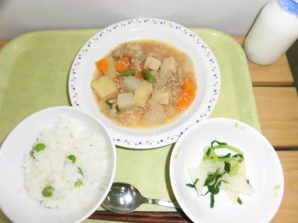 「グリンピースごはん、新じゃが芋のそぼろ煮、蕪のレモン醤油かけ、牛乳」です。