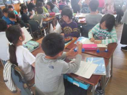 注射器の中に入れたマシュマロの変化に、子どもたちからは歓声が上がりました。その変化の様子から自分の考えを、イメージ図や言葉で表現し、グループで意見交換をしました。自分の考えを何とか説明しようとどの子も一生懸命で、いろいろな考えを仲間同士で交流していく中で、学びは深まります。