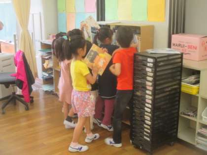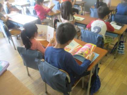 木曜日の朝は図書タイムです。低学年の子どもたちは読み聞かせが大好きですが、自分で選んだ本を読むのも楽しそうです。じっくり15分間本に親しんだ後は、片付けもしっかりできる子どもたちです。