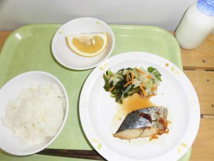 「ごはん、鰆の生姜焼き、春野菜のわかめのサラダ、美生柑、牛乳」です。