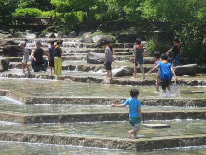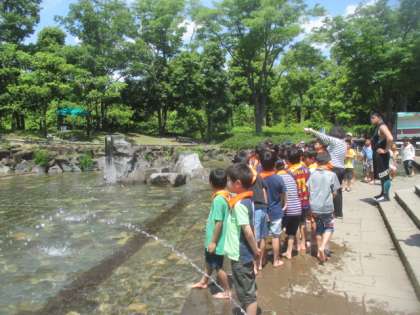 お弁当の後は、遠足の後半戦。これも楽しみにしていた水遊びの時間です。水遊びの池は、八幡山小の子どもたちで貸し切り状態になり、ほぼ全員の子どもたちが、思いっきり池の中に入って楽しみました。