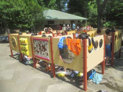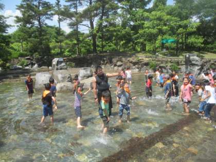 先生もいっしょに池の入って子どもたちとたわれていました。着替えを持ってきているので安心です。雲一つないお天気で、とても気持ちのよい水遊びができました。