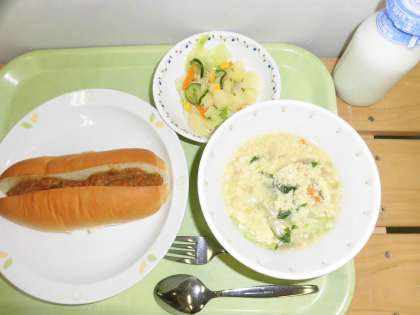 「ドライカレーサンド、チーズのふわふわスープ、ポテト入りフレンチサラダ、牛乳」です。