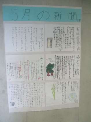 広報委員会が作成した5月の新聞が掲載されています。「ゴールデンウィーク」・「憲法記念日」・「かしわもち」・「こいのぼり」といった季節の話題が紹介されています。ちょっと立ち止まってじっくりと見てください。