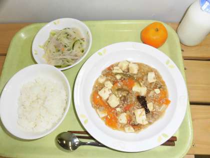 「ごはん、西湖豆腐、春雨サラダ、冷凍みかん、牛乳」です。
